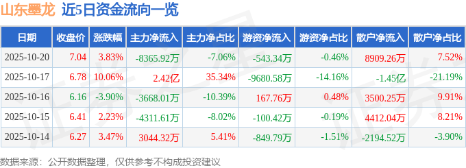 证券之星消息,截至2025年10月20日收盘,山东墨龙(002490)报收于7.04元,上涨3.83%,换手率30.78%,成交量166.77万手,成交额11.84亿元。