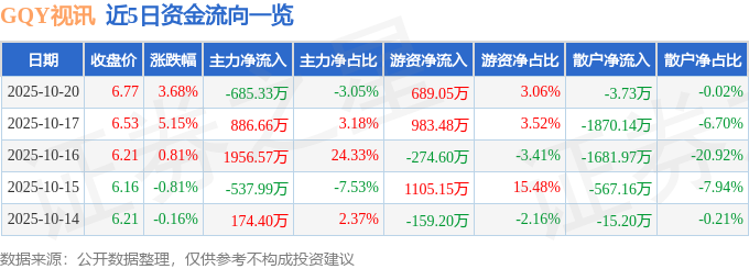 证券之星消息,截至2025年10月20日收盘,GQY视讯(300076)报收于6.77元,上涨3.68%,换手率7.88%,成交量33.43万手,成交额2.25亿元。