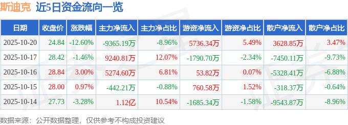 证券之星消息,截至2025年10月20日收盘,斯迪克(300806)报收于24.84元,下跌12.6%,换手率12.68%,成交量40.11万手,成交额10.45亿元。