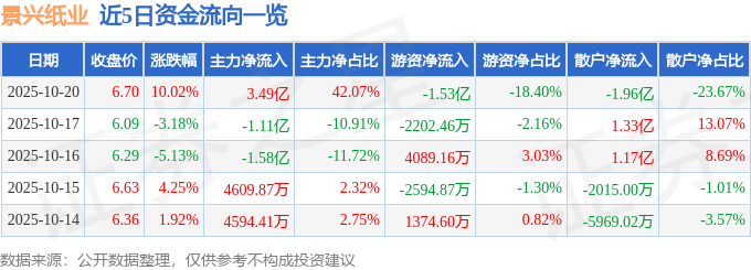证券之星消息,景兴纸业10月20日涨停收盘,收盘价6.7元。该股于9点38分涨停,未打开涨停,截止收盘封单资金为2.27亿元,占其流通市值2.61%。