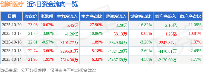 证券之星消息,创新医疗10月20日涨停收盘,收盘价23.93元。该股于10点39分涨停,未打开涨停,截止收盘封单资金为1.96亿元,占其流通市值1.97%。