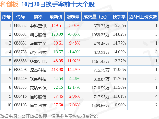 当日科创板换手率前10大个股中6只个股收涨,平均涨幅7.51%,其中中科蓝讯(688332)以换手率15.33%排第一,5只个股近5个交易日中多次上榜。