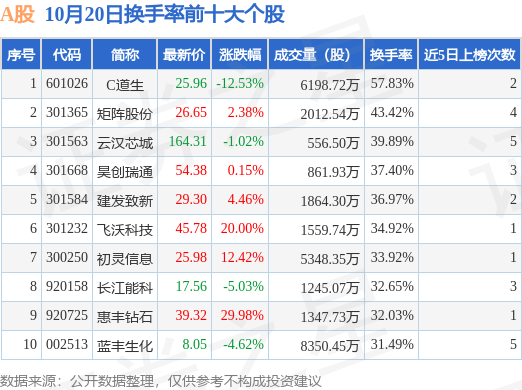 当日A股换手率前10大个股中6只个股收涨,平均涨幅11.56%,其中C道生(601026)以换手率57.83%排第一,7只个股近5个交易日中多次上榜。