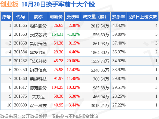 当日创业板换手率前10大个股中9只个股收涨,平均涨幅7.78%,其中矩阵股份(301365)以换手率43.42%排第一,5只个股近5个交易日中多次上榜。