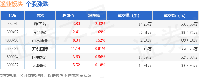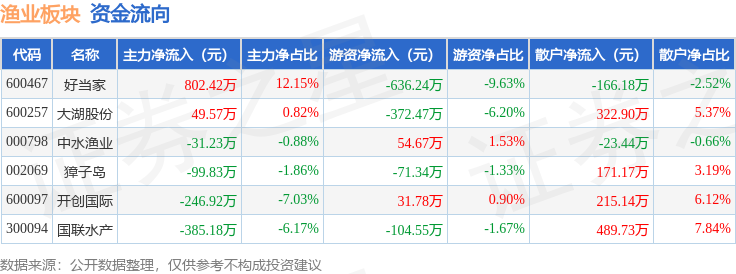 从资金流向上来看,当日渔业板块主力资金净流入88.83万元,游资资金净流出1098.15万元,散户资金净流入1009.32万元。渔业板块个股资金流向见下表:
