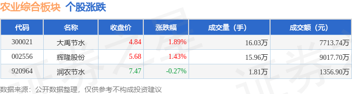 证券之星消息,10月20日农业综合板块较上一交易日上涨1.63%,大禹节水领涨。当日上证指数报收于3863.89,上涨0.63%。深证成指报收于12813.21,上涨0.98%。农业综合板块个股涨跌见下表: