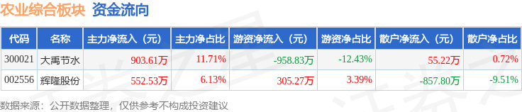 从资金流向上来看,当日农业综合板块主力资金净流入1456.14万元,游资资金净流出653.56万元,散户资金净流出802.58万元。农业综合板块个股资金流向见下表: