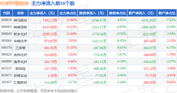 从资金流向上来看,当日化学纤维板块主力资金净流入2241.75万元,游资资金净流出8623.54万元,散户资金净流入6381.79万元。化学纤维板块个股资金流向见下表: