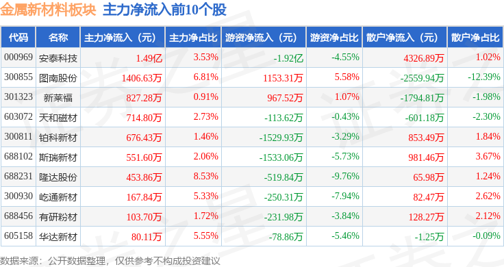 从资金流向上来看,当日金属新材料板块主力资金净流出1.7亿元,游资资金净流出3.29亿元,散户资金净流入4.99亿元。金属新材料板块个股资金流向见下表: