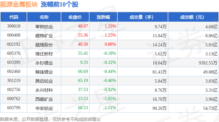 证券之星消息,10月20日能源金属板块较上一交易日下跌0.83%,盛新锂能领跌。当日上证指数报收于3863.89,上涨0.63%。深证成指报收于12813.21,上涨0.98%。能源金属板块个股涨跌见下表: