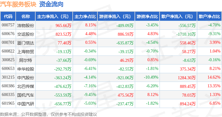 从资金流向上来看,当日汽车服务板块主力资金净流出533.21万元,游资资金净流出1329.58万元,散户资金净流入1862.79万元。汽车服务板块个股资金流向见下表: