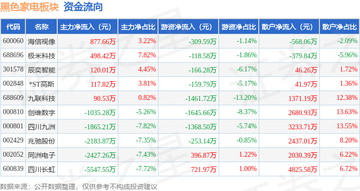 从资金流向上来看,当日黑色家电板块主力资金净流出1.14亿元,游资资金净流出4364.42万元,散户资金净流入1.57亿元。黑色家电板块个股资金流向见下表: