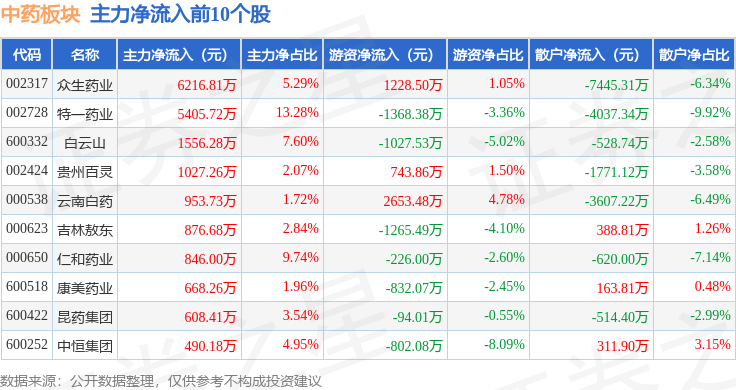 从资金流向上来看,当日中药板块主力资金净流出3.71亿元,游资资金净流入1.17亿元,散户资金净流入2.53亿元。中药板块个股资金流向见下表: