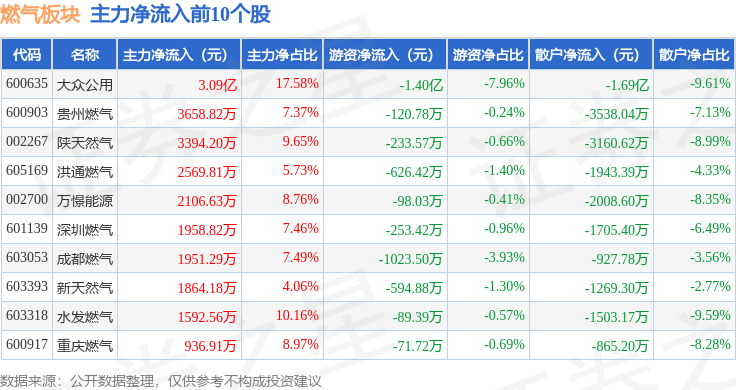 从资金流向上来看,当日燃气板块主力资金净流入3.65亿元,游资资金净流出7498.15万元,散户资金净流出2.9亿元。燃气板块个股资金流向见下表: