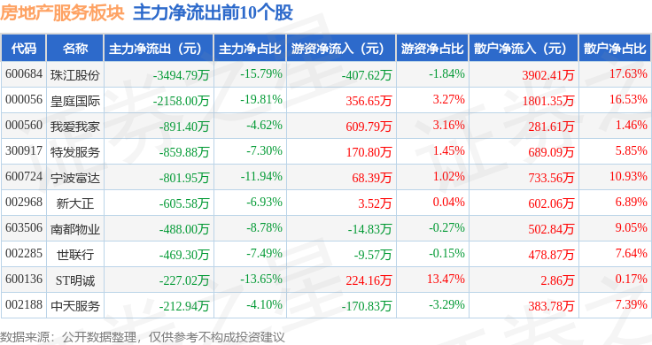 从资金流向上来看,当日房地产服务板块主力资金净流出1.02亿元,游资资金净流入539.03万元,散户资金净流入9701.82万元。房地产服务板块个股资金流向见下表: