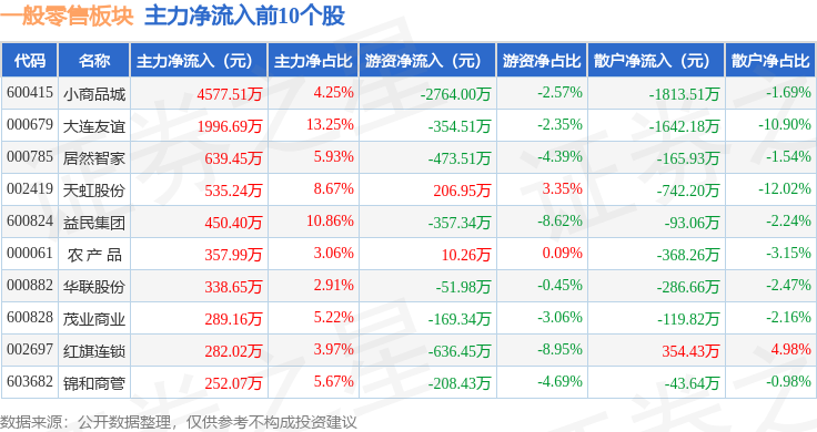 从资金流向上来看,当日一般零售板块主力资金净流出4.23亿元,游资资金净流出6905.62万元,散户资金净流入4.92亿元。一般零售板块个股资金流向见下表: