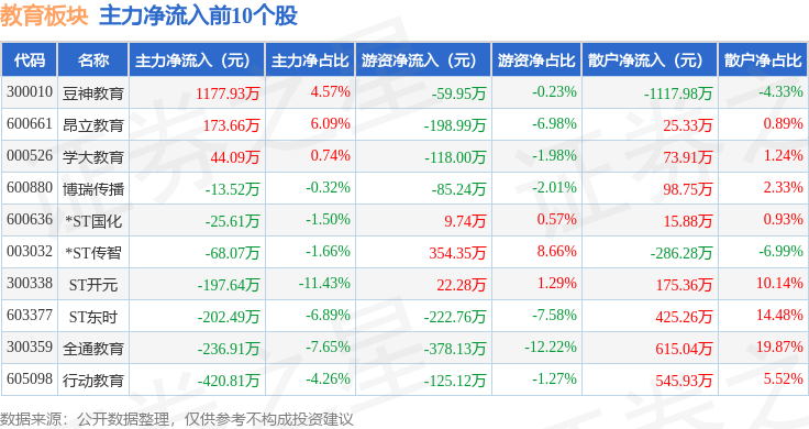 从资金流向上来看,当日教育板块主力资金净流出6300.74万元,游资资金净流出3065.72万元,散户资金净流入9366.47万元。教育板块个股资金流向见下表: