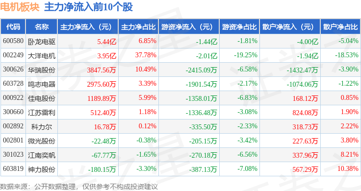 从资金流向上来看,当日电机板块主力资金净流入8.33亿元,游资资金净流出4.18亿元,散户资金净流出4.15亿元。电机板块个股资金流向见下表: