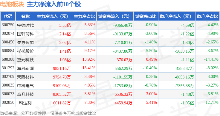 从资金流向上来看,当日电池板块主力资金净流入1016.27万元,游资资金净流出6.64亿元,散户资金净流入6.54亿元。电池板块个股资金流向见下表: