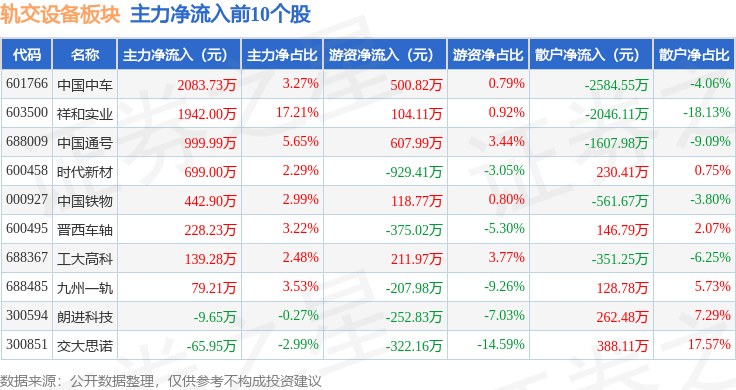 从资金流向上来看,当日轨交设备板块主力资金净流出3836.15万元,游资资金净流入623.25万元,散户资金净流入3212.9万元。轨交设备板块个股资金流向见下表: