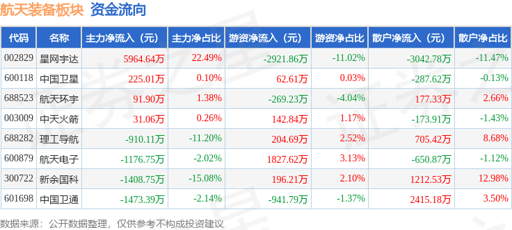 从资金流向上来看,当日航天装备板块主力资金净流入1343.61万元,游资资金净流出1698.89万元,散户资金净流入355.28万元。航天装备板块个股资金流向见下表: