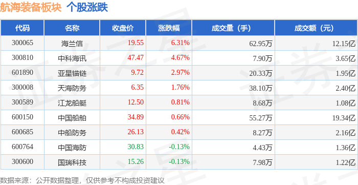 证券之星消息,10月20日航海装备板块较上一交易日上涨0.94%,海兰信领涨。当日上证指数报收于3863.89,上涨0.63%。深证成指报收于12813.21,上涨0.98%。航海装备板块个股涨跌见下表: