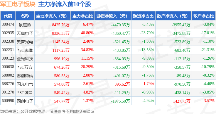 从资金流向上来看,当日军工电子板块主力资金净流出3.99亿元,游资资金净流出3716.18万元,散户资金净流入4.36亿元。军工电子板块个股资金流向见下表: