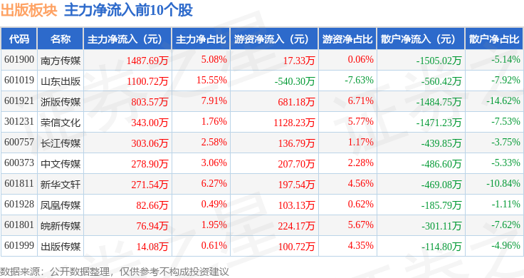 从资金流向上来看,当日出版板块主力资金净流出1.13亿元,游资资金净流入6400.57万元,散户资金净流入4892.06万元。出版板块个股资金流向见下表: