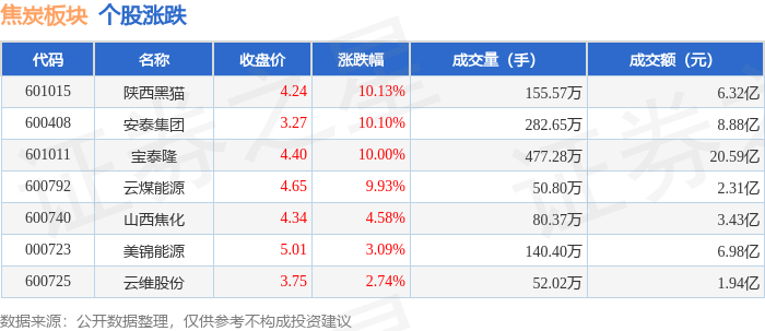证券之星消息,10月20日焦炭板块较上一交易日上涨6.02%,陕西黑猫领涨。当日上证指数报收于3863.89,上涨0.63%。深证成指报收于12813.21,上涨0.98%。焦炭板块个股涨跌见下表: