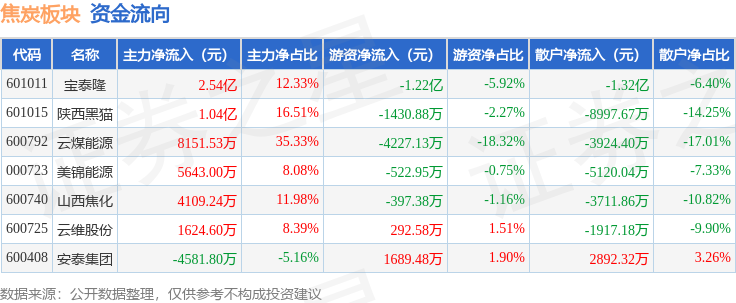 从资金流向上来看,当日焦炭板块主力资金净流入5.08亿元,游资资金净流出1.68亿元,散户资金净流出3.4亿元。焦炭板块个股资金流向见下表: