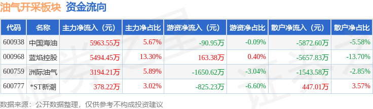 从资金流向上来看,当日油气开采板块主力资金净流入1.5亿元,游资资金净流出2403.43万元,散户资金净流出1.26亿元。油气开采板块个股资金流向见下表: