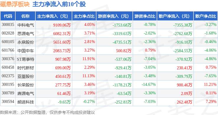 从资金流向上来看,当日磁悬浮板块主力资金净流出4.32亿元,游资资金净流出1.21亿元,散户资金净流入5.53亿元。磁悬浮板块个股资金流向见下表: