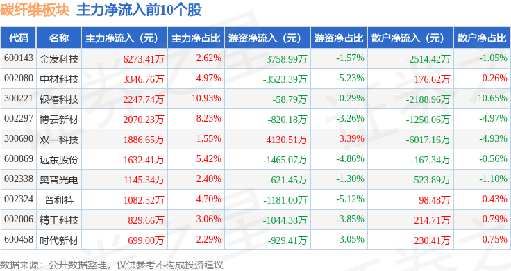 从资金流向上来看,当日碳纤维板块主力资金净流出3.41亿元,游资资金净流入5659.91万元,散户资金净流入2.85亿元。碳纤维板块个股资金流向见下表: