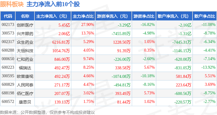 从资金流向上来看,当日眼科板块主力资金净流入4.1亿元,游资资金净流出3.06亿元,散户资金净流出1.04亿元。眼科板块个股资金流向见下表: