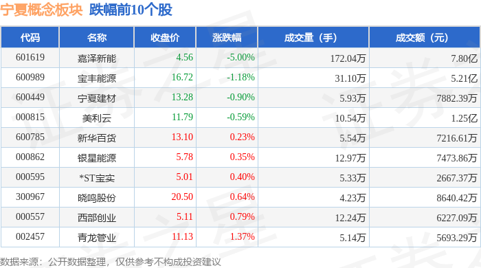从资金流向上来看,当日宁夏概念板块主力资金净流出1.14亿元,游资资金净流入5813.25万元,散户资金净流入5547.07万元。宁夏概念板块个股资金流向见下表: