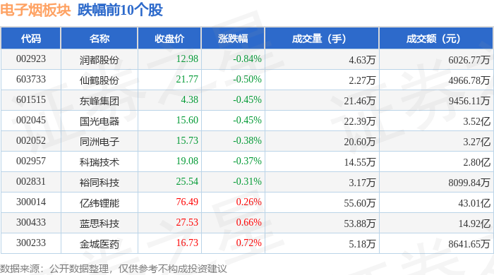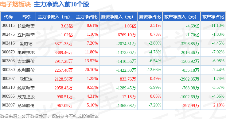从资金流向上来看,当日电子烟板块主力资金净流出2.35亿元,游资资金净流入3853.2万元,散户资金净流入1.96亿元。电子烟板块个股资金流向见下表: