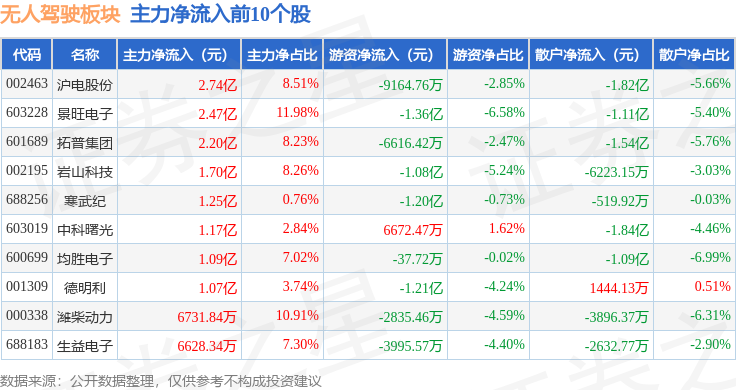 从资金流向上来看,当日无人驾驶板块主力资金净流出16.64亿元,游资资金净流出6.48亿元,散户资金净流入23.12亿元。无人驾驶板块个股资金流向见下表:
