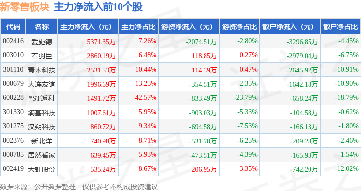 从资金流向上来看,当日新零售板块主力资金净流出4.01亿元,游资资金净流出7861.0万元,散户资金净流入4.8亿元。新零售板块个股资金流向见下表: