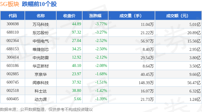 从资金流向上来看,当日5G板块主力资金净流入44.85亿元,游资资金净流出51.73亿元,散户资金净流入6.88亿元。5G板块个股资金流向见下表: