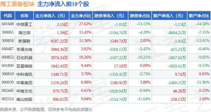 从资金流向上来看,当日海工装备板块主力资金净流入1.22亿元,游资资金净流出1.08亿元,散户资金净流出1453.91万元。海工装备板块个股资金流向见下表: