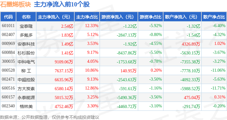 从资金流向上来看,当日石墨烯板块主力资金净流入2.99亿元,游资资金净流出6.35亿元,散户资金净流入3.36亿元。石墨烯板块个股资金流向见下表: