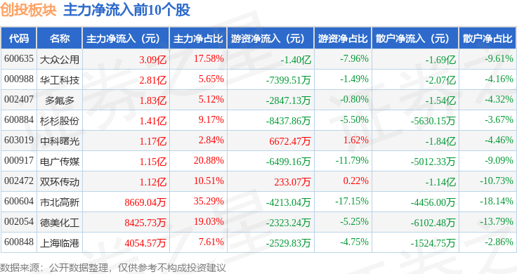 从资金流向上来看,当日创投板块主力资金净流入11.51亿元,游资资金净流出7.15亿元,散户资金净流出4.36亿元。创投板块个股资金流向见下表: