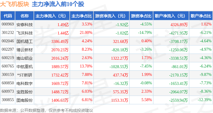 从资金流向上来看,当日大飞机板块主力资金净流出10.1亿元,游资资金净流出2.5亿元,散户资金净流入12.59亿元。大飞机板块个股资金流向见下表:
