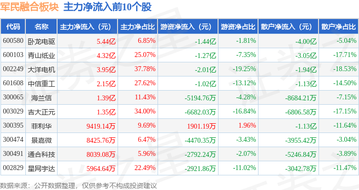 从资金流向上来看,当日军民融合板块主力资金净流入2.45亿元,游资资金净流出10.92亿元,散户资金净流入8.48亿元。军民融合板块个股资金流向见下表: