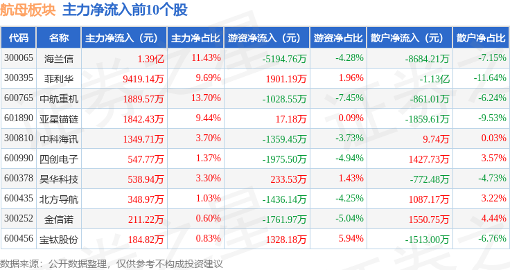 从资金流向上来看,当日航母板块主力资金净流出1.39亿元,游资资金净流出2194.86万元,散户资金净流入1.61亿元。航母板块个股资金流向见下表: