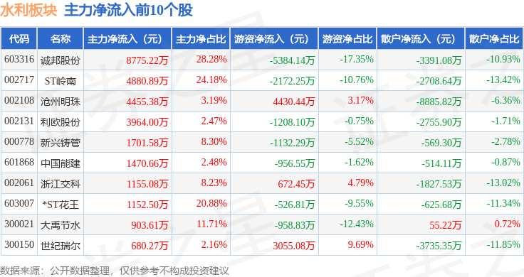 从资金流向上来看,当日水利板块主力资金净流出3.93亿元,游资资金净流出3449.69万元,散户资金净流入4.27亿元。水利板块个股资金流向见下表: