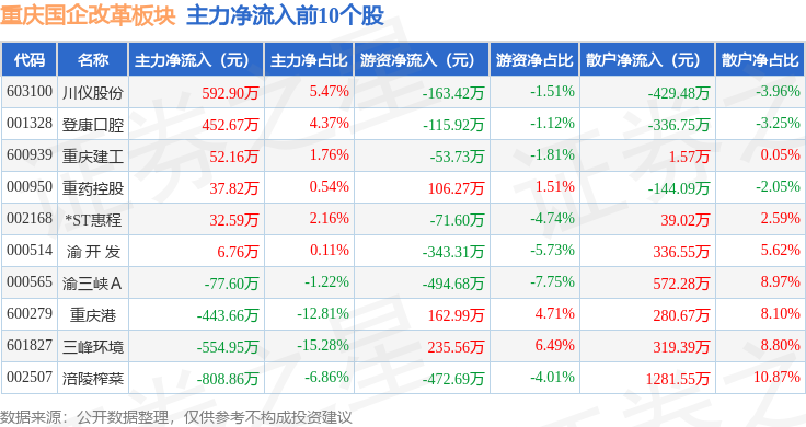 从资金流向上来看,当日重庆国企改革板块主力资金净流出8137.04万元,游资资金净流入2813.99万元,散户资金净流入5323.05万元。重庆国企改革板块个股资金流向见下表:
