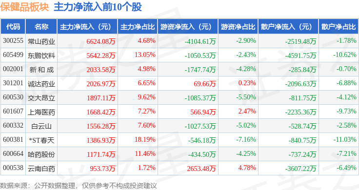 从资金流向上来看,当日保健品板块主力资金净流出2.44亿元,游资资金净流出76.22万元,散户资金净流入2.45亿元。保健品板块个股资金流向见下表: