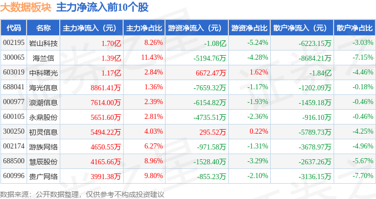 从资金流向上来看,当日大数据板块主力资金净流出22.02亿元,游资资金净流出5.28亿元,散户资金净流入27.3亿元。大数据板块个股资金流向见下表: