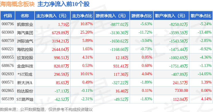 从资金流向上来看,当日海南概念板块主力资金净流出7.68亿元,游资资金净流入2.36亿元,散户资金净流入5.32亿元。海南概念板块个股资金流向见下表: